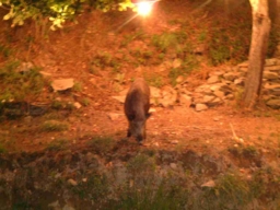 In un primo momento la signora non scorse che una grossa massa scura che si aggirava sotto il susino, poi, a distanza un’altra un pò meno robusta che si aggirava nervosamente avanti e indietro e solo dopo che gli occhi della signora si abituarono al buio videro due piccoli bagliori lucidi ficcanti in un grosso testone che la fissavano incuranti capì che si trattava di un maestoso Cinghiale.